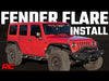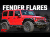 Easy bolt-on installation. Made of UV Treated Thermoplastic. Installation hardware included. Complete set for front and rear fenders. Increases tire clearance. Protects vehicle from on & off-road debris. Provides 9-inches of front tire coverage. Provides 4.5-inches of rear tire coverage. Note: LEDs are for off-road use only California Residents: Prop65 Warning <p><strong>Innovative Design and Added Protection</strong>. Increase your Wrangler's tire clearance and protective features while adding impressive good looks with Rough Country's High Clearance Flat Fender Flares. These aggressively good-looking flares transform your JK's exterior boasting 9-inches of front tire coverage and 4.5-inches of rear tire coverage these uniquely designed flares are sure to protect your Jeep's body from mud or road debris kicked up by the tires.</p> <p><strong>Lightweight and Durable.</strong> Designed to handle on or off-road terrain Rough Country's fender flares are constructed of a flexible UV Stable Black TPO plastic. This material is lightweight and can endure the elements. The UV treatment process eliminates chalking and helps prevent sun fading. Each flare set features two led front marker lights, each marker features 6 bright LEDs that are sure to keep you visible at night!</p> <p><strong>Installation. </strong>Requiring minor drilling and wiring to install, installation couldn't be easier. With an estimated timeframe of 2-3 hours this full kit can be installed at home using standard tools and can be completed efficiently and quickly!</p> <p><strong>Limited Lifetime Replacement Warranty.</strong> Rough Country's High Clearance Flat Fender Flares are backed with a limited lifetime replacement warranty towards manufacturer defects. As such, the product is protected from structural and workmanship damage after the date of purchase. With our industry-leading warranty give yourself peace of mind when using Rough Country products!</p>